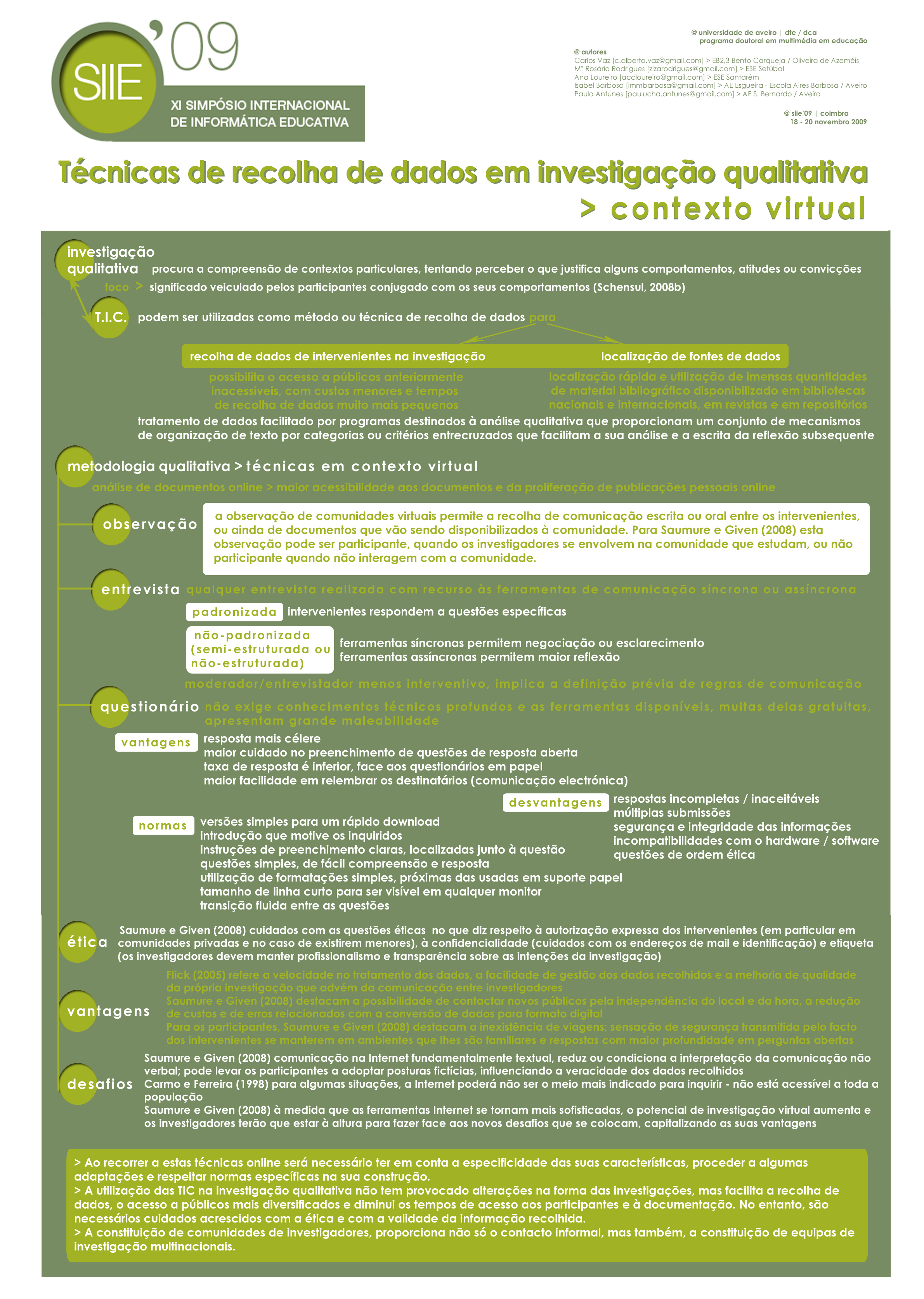 Vaz, C., Rodrigues, M., Loureiro, A., Barbosa, I., & Antunes, P. (2009). (2009). Técnicas de recolha de dados em investigação qualitativa – uso das TIC. Poster presented at the XI SIIE’09 – International Symposium on Computers in Education, University of Coimbra – Portugal, 18 to 20 November 2009.